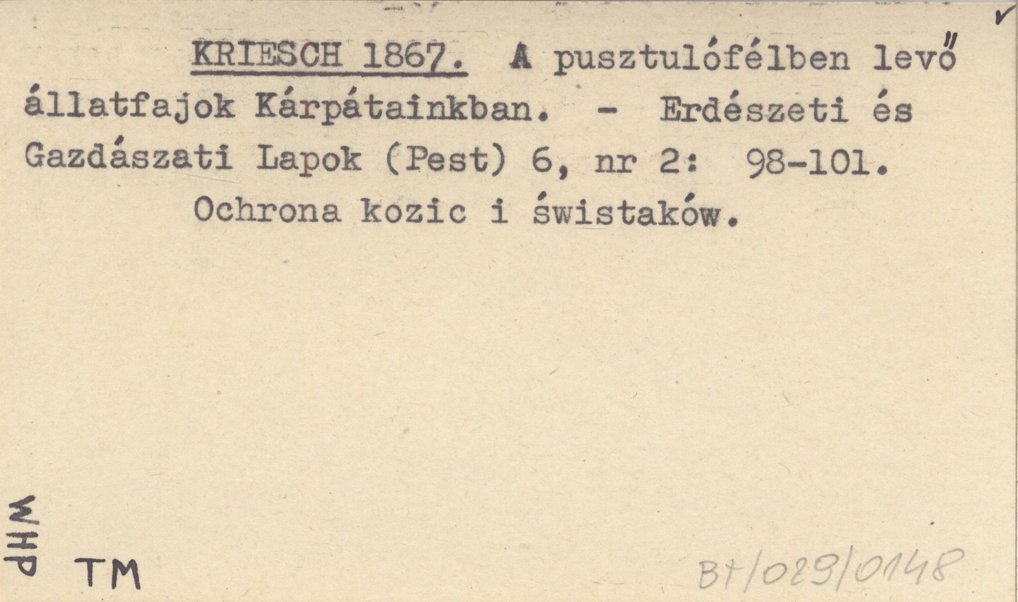 KRIESCH 1867 A pusztulófélben levő állatfajok Kárpátainkban.
