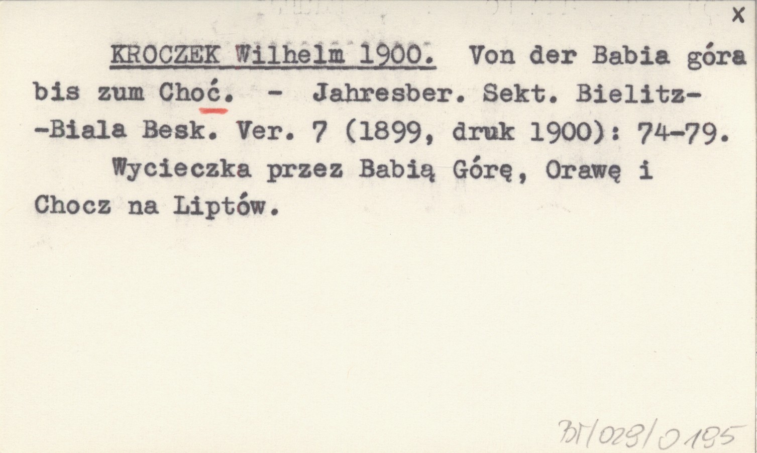 Jahresber. Sekt. Bielitz-Biala Besk. Ver., 7 (1899, druk 1900): 74-79. Wycieczka przez Babią Górę, Orawę i Chocz na Liptów.