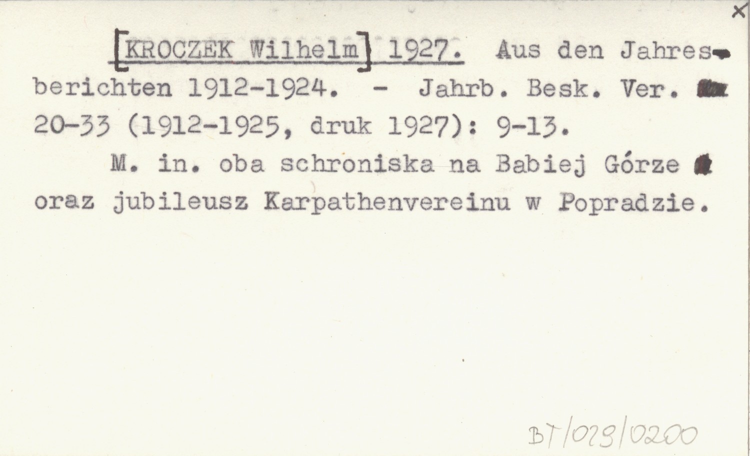 Jahresber. Sekt. Bielitz-Biala Besk. Ver., 20-33 (1912-1925, druk 1927): 9-13. M. in. oba schroniska na Babiej Górze oraz jubileusz Karpathenvereinu w Popradzie.