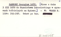 BARSONY Georgius 1670 [Pismo z dnia 3 XII 1670 do Stanisława Lubomirskiego w sprawach kościelnych na Spiszu.]
