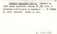 BARSONY Georgius 1674 a [Mandat do XIII miast spiskich, wydany 29 XII 1674, w sprawach kościelnych na Spiszu.]