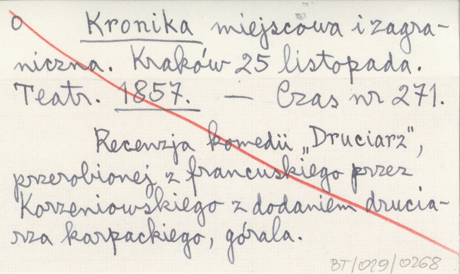 Czas, Nr 271. Recenzja komedii "Druciarz", przerobionej z francuskiego przez Korzeniowskiego z dodaniem druciarza karpackiego, górala.
