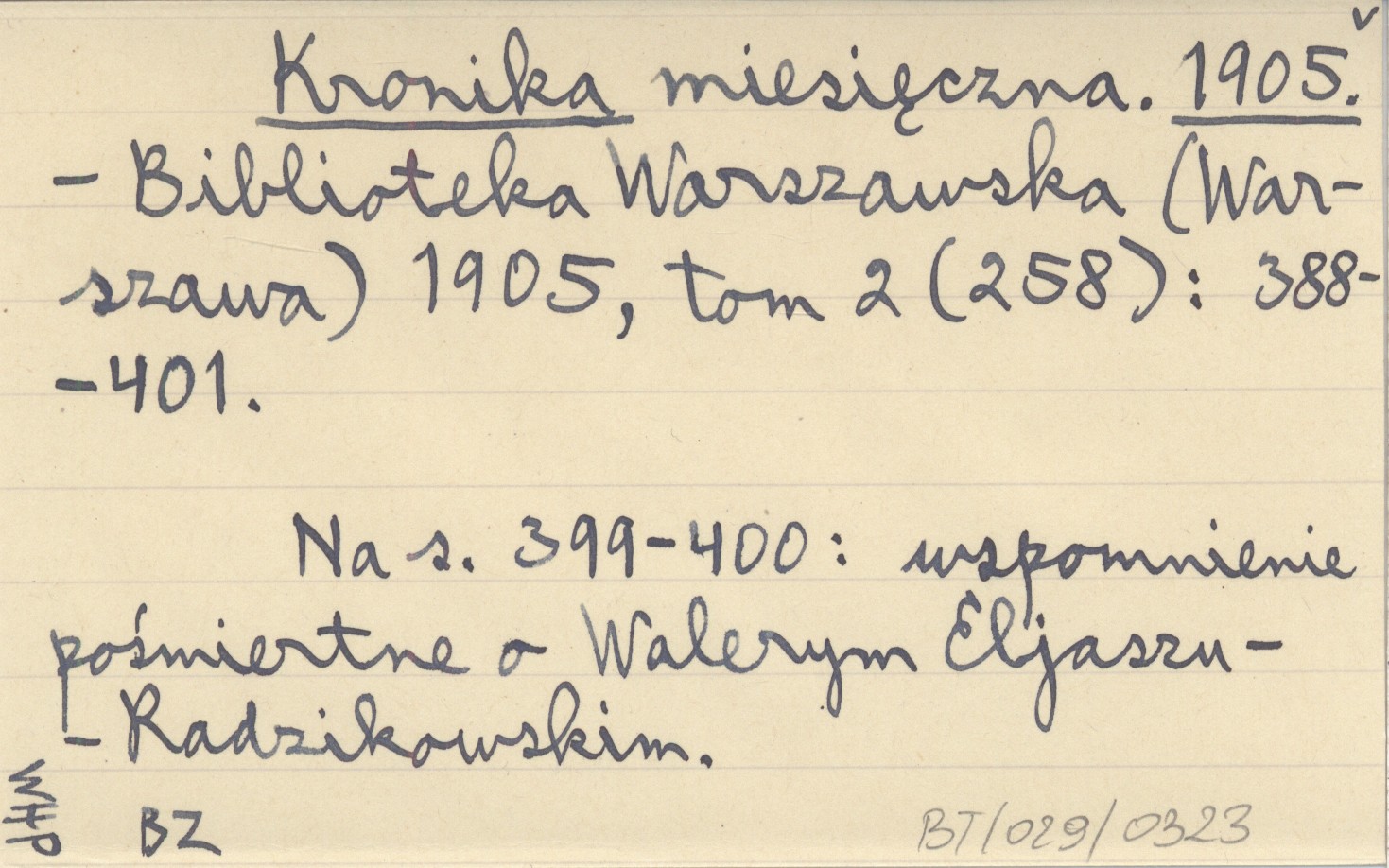 Biblioteka Warszawska (Warszawa) , T. 2 (258): 388-401. Na s. 399-400: wspomnienie pośmiertne o Walerym Eljaszu-Radzikowskim.