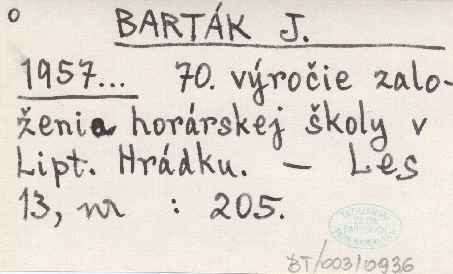 BARTÁK J. 1957... 70. výročie založenia horárskej školy v Lipt. Hrádku.