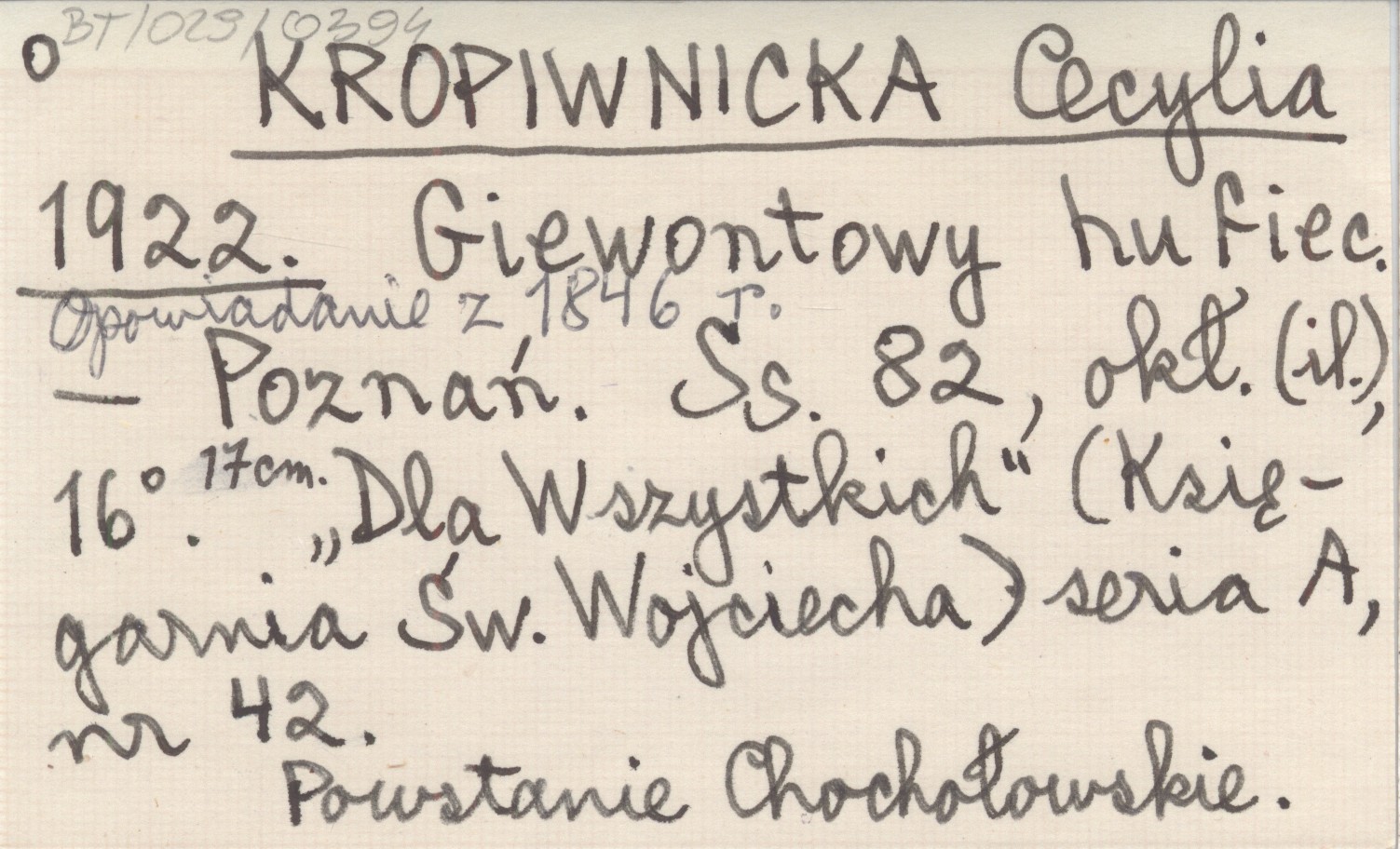Poznań , 82 s., okł. (il.), 16°, 17 cm. Powstanie Chochołowskie. "Dla Wszystkich" (Księgarnia Św. Wojciecha) ser. A, nr 42.