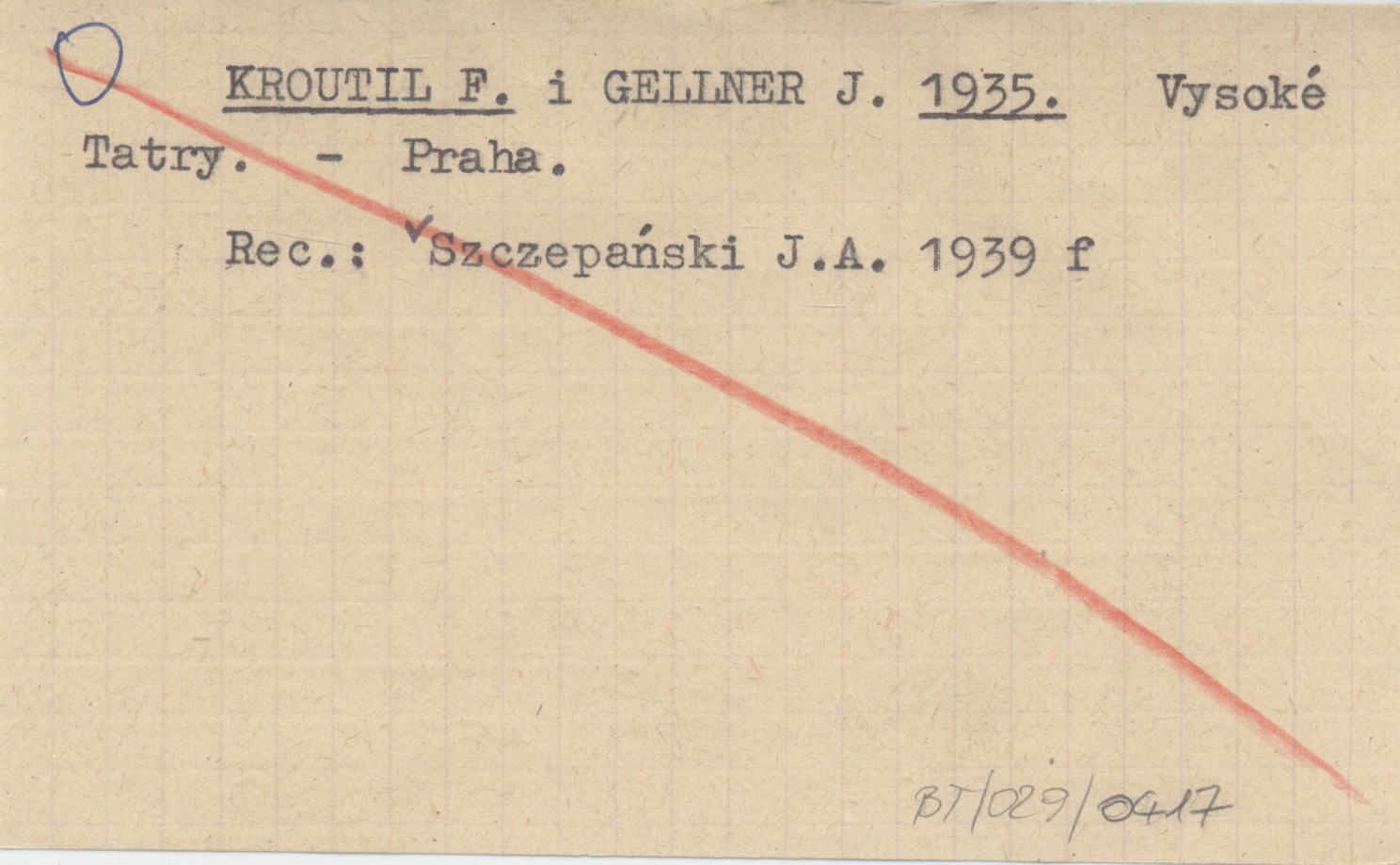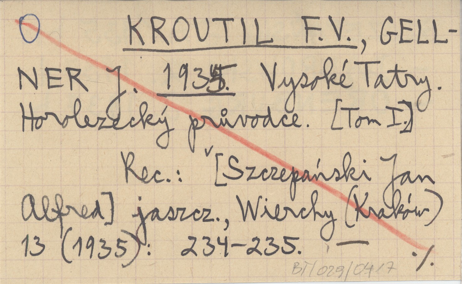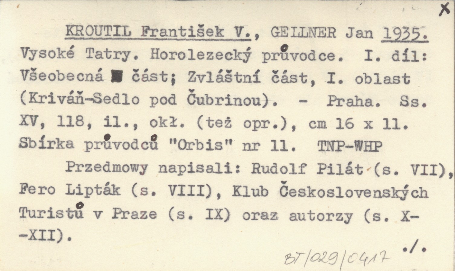 KROUTIL František V. GELLNER, Jan. ; 1935 Vysoké Tatry. Horolezecký průvodce. I. díl: Všeobecná část ; Zvláštní část, I. oblast (Kriváň-Sedlo pod Čubrinou).
