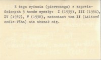 Praha (Sbírka průvodců "Orbis", nr 11) , XV, 118 s., il., okł. (też opr.), 16x11 cm. Przedmowy napisali: Rudolf Pilát (s. VII), Fero Lipták (s. VIII), Klub Československých Turistů v Praze (s. IX) oraz autorzy (s. X-XII). Z tego wydania (pierwszego) z zapowiedzianych 5 tomów wyszły: I (1935), III(1936), IV (1937), V (1938), natomiast tom II (Liliové sedlo-Váha) nie ukazał się. REC: [SZCZEPAŃSKI Jan Alfred] jaszcz., Wierchy (Kraków) 13 (1935): 234-235 ; DĄBROWSKI Z. 1937 d ; ORENBURG J. 1937 b ; SZCZEPAŃSKI J. A. 1935 br, 1939 f ;