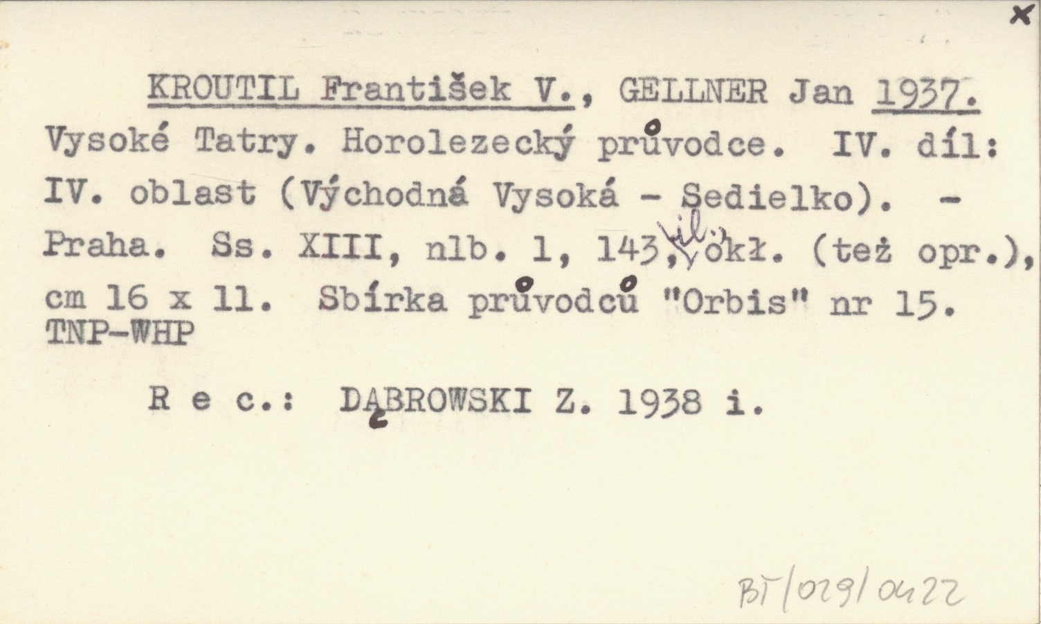 KROUTIL František V. GELLNER, Jan. ; 1937 Vysoké Tatry. Horolezecký průvodce. IV. díl: IV. oblast (Východná Vysoká-Sedielko).