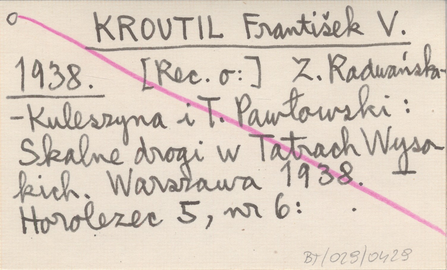 KROUTIL František V. 1938 [Rec. o:] Z. Radwańska-Kuleszyna i T. Pawłowski: Skalne drogi w Tatrach Wysokich. Warszawa 1938.