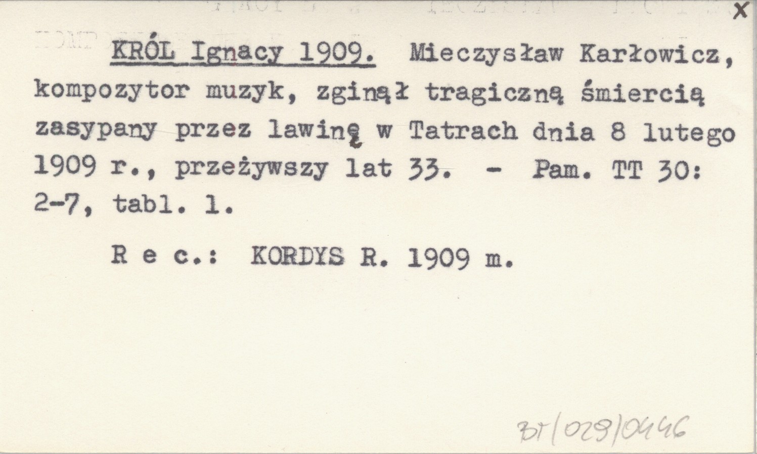 KRÓL Ignacy 1909 Mieczysław Karłowicz, kompozytor muzyk, zginął tragiczną śmiercią zasypany przez lawinę w Tatrach dnia 8 lutego 1909 r., przeżywszy lat 33.