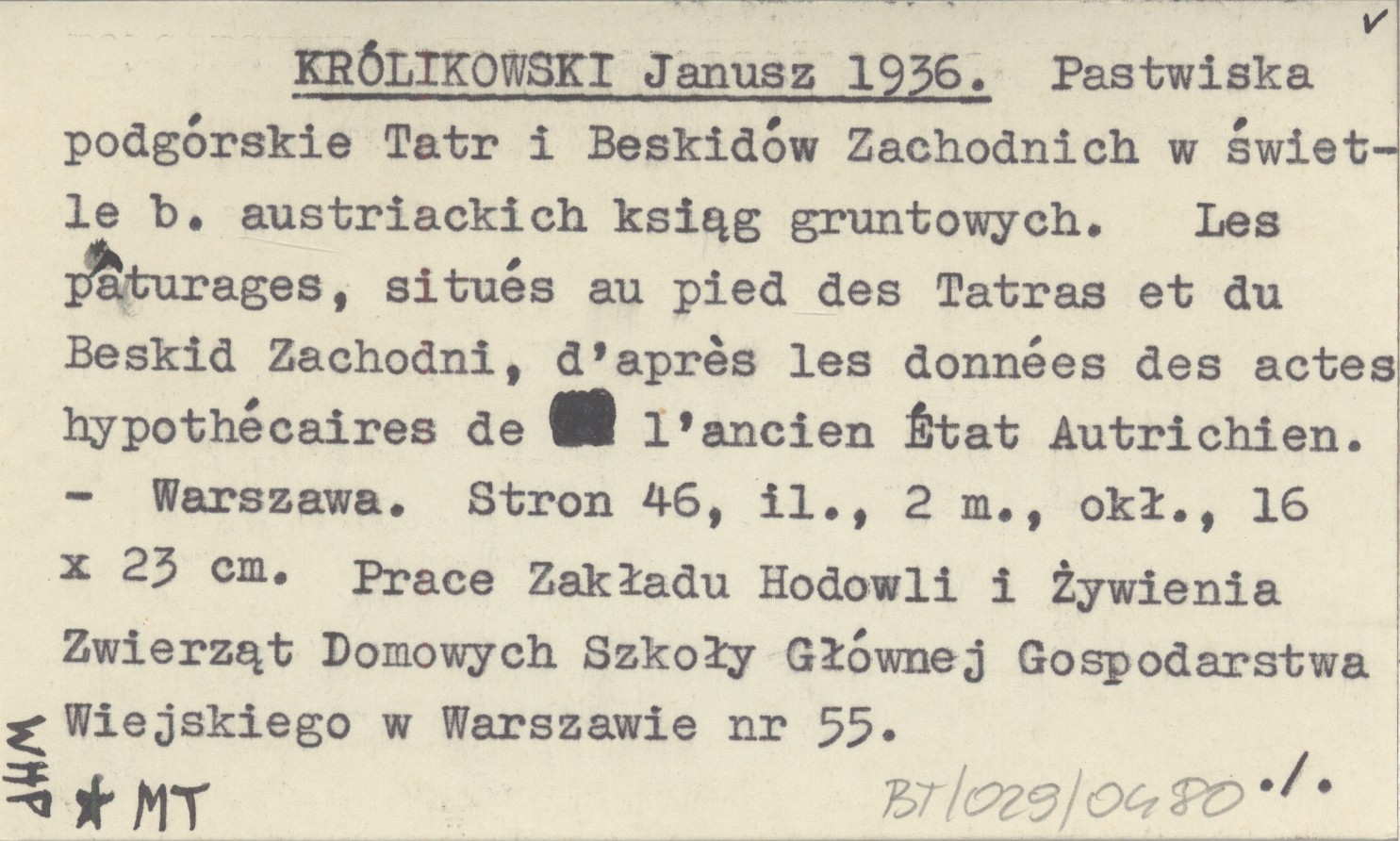 KRÓLIKOWSKI Janusz 1936 Pastwiska podgórskie Tatr i Beskidów Zachodnich w świetle b. austriackich ksiąg gruntowych. Les paturages, situés au pied des Tatras et du Beskid Zachodni, d'aprés les données des actes hypothécaires de l'ancien État Autrichien.