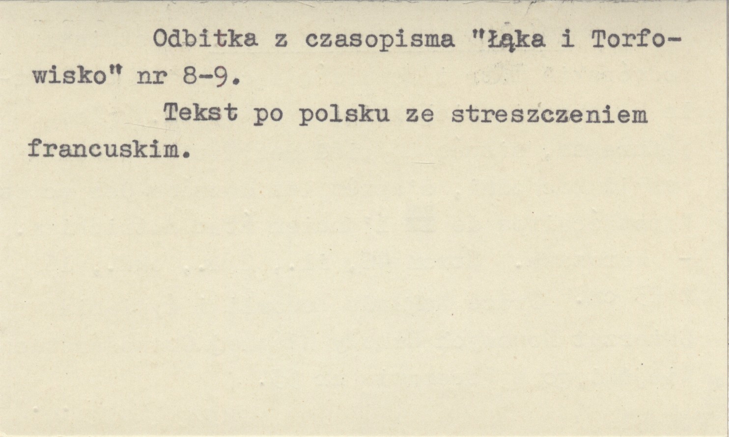 Warszawa , 46 s., il., 2 mapy, okł., 16x23 cm. Prace Zakładu Hodowli i Żywienia Zwierząt Domowych Szkoły Głównej Gospodarstwa Wiejskiego w Warszawie Odbitka z czasopisma" Łąka i Torfowisko" nr 8-9. Tekst po polsku ze streszczeniem francuskim. REC: Nr 55.