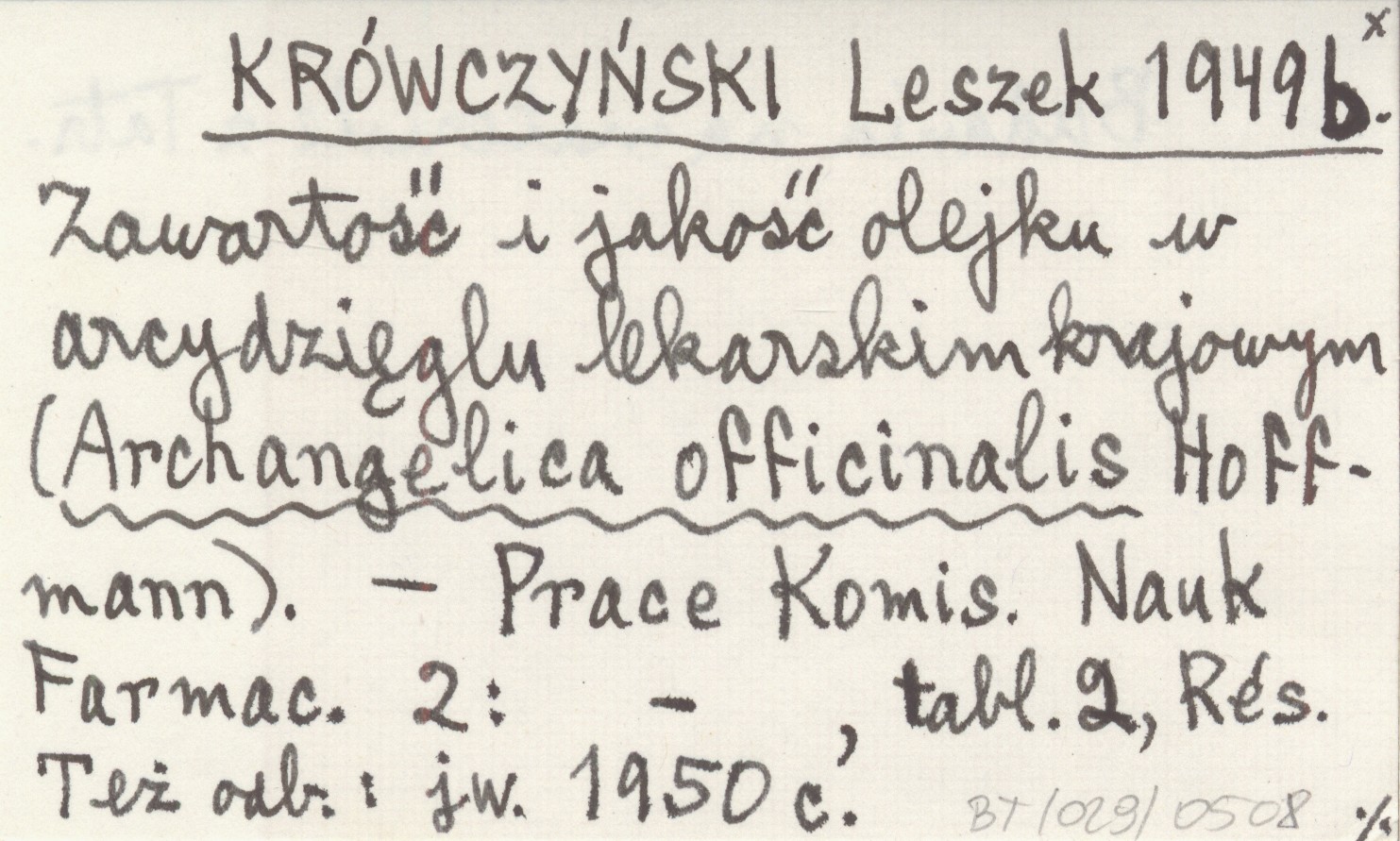 KRÓWCZYŃSKI Leszek 1949 b Zawartość i jakość olejku w arcydzięglu lekarskim krajowym (Archangelica officinalis Hoffmann).