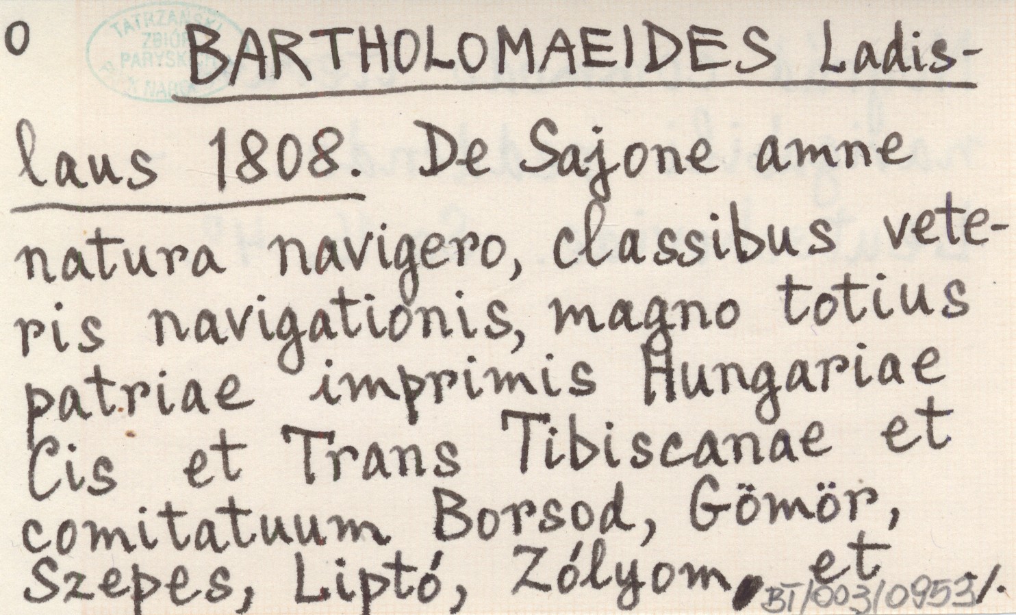 BARTHOLOMAEIDES Ladislaus 1808 De Sajone amne natura navigero, classibus veteris navigationis, magno totius patriae imprimis Hungariae Cis et Trans Tibiscanae et comitatuum Borsod, Gömör, Szepes, Liptó, Zólyom, et Nográd commodo iterium navigabili reddendo.