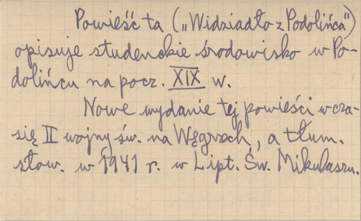 , Powieść ta ("Widziadło z Podolińca") opisuje studenckie środowisko w Podolińcu na pocz. XIX w. Nowe wydanie tej powieści w czasie II wojny św. na Węgrzech, a tłum. słow. w 1941 r. w Lipt. Św. Mikulaszu. REC: GRÉB Julius, Karpathenland (Reichenberg) 5 (1932): 42 ; REYCHMAN J. 1947 n ;