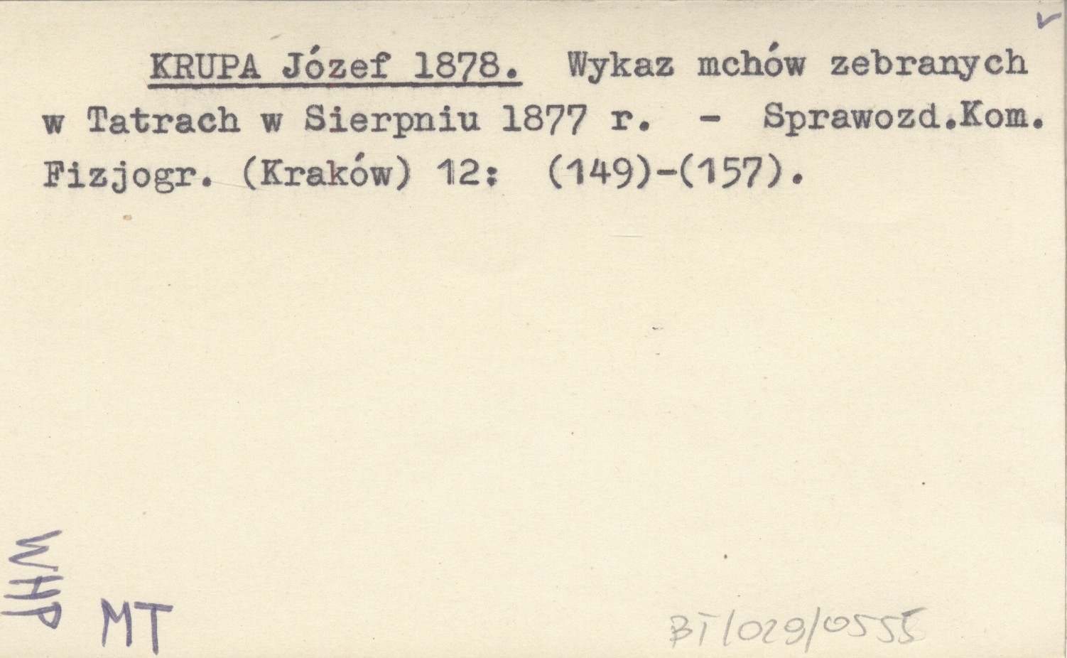 KRUPA Józef 1878 Wykaz mchów zebranych w Tatrach w Sierpniu 1877 r.