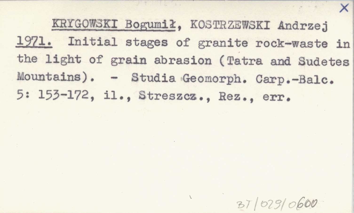 KRYGOWSKI Bogumił KOSTRZEWSKI, Andrzej. ; 1971 Initial stages of granite rock-waste in the light of grain abrasion (Tatra and Sudetes Mountains).