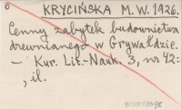 KRYCIŃSKA M. W. 1926 Cenny zabytek budownictwa drewnianego w Grywałdzie. (Położenie kościółka. Piękna forma architekt. i wnętrza. Polichromia. Chrońmy zabytek od zagłady).