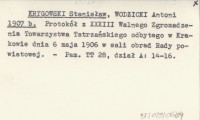 KRYGOWSKI Stanisław WODZICKI, Antoni. ; 1907 b Protokół z XXXIII Walnego Zgromadzenia Towarzystwa Tatrzańskiego odbytego w Krakowie dnia 6 maja 1906 w sali obrad Rady powiatowej.