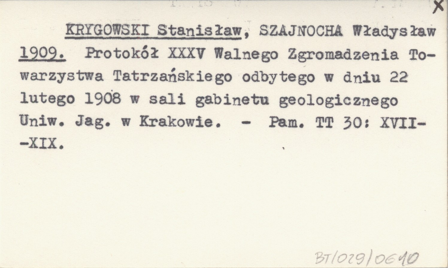 KRYGOWSKI Stanisław SZAJNOCHA, Władysław. ; 1909 Protokół XXXV Walnego Zgromadzenia Towarzystwa Tatrzańskiego odbytego w dniu 22 lutego 1908 w sali gabinetu geologicznego Uniw. Jag. w Krakowie.