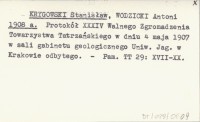KRYGOWSKI Stanisław WODZICKI, Antoni. ; 1908 a Protokół XXXIV Walnego Zgromadzenia Towarzystwa Tatrzańskiego w dniu 4 maja 1907 w sali gabinetu geologicznego Uniw. Jag. w Krakowie odbytego.