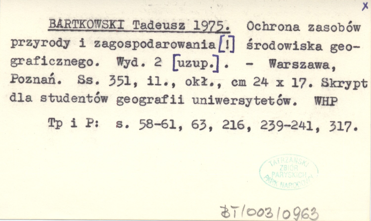 BARTKOWSKI Tadeusz 1975 Ochrona zasobów przyrody i zagospodarowania [!] środowiska geograficznego.