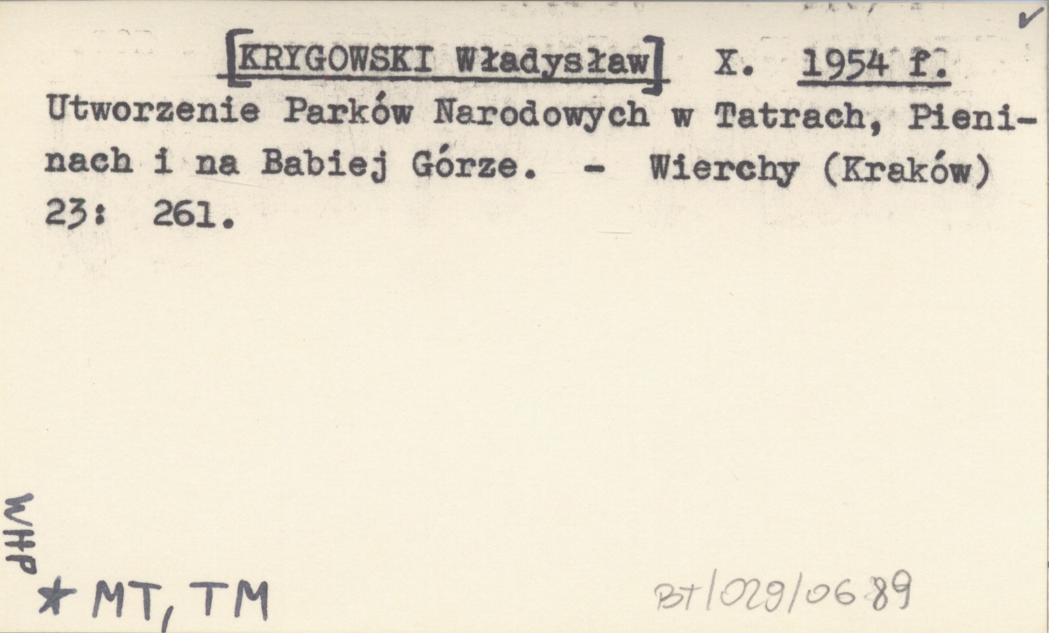 X. [KRYGOWSKI Władysław] 1954 f Utworzenie Parków Narodowych w Tatrach, Pieninach i na Babiej Górze.