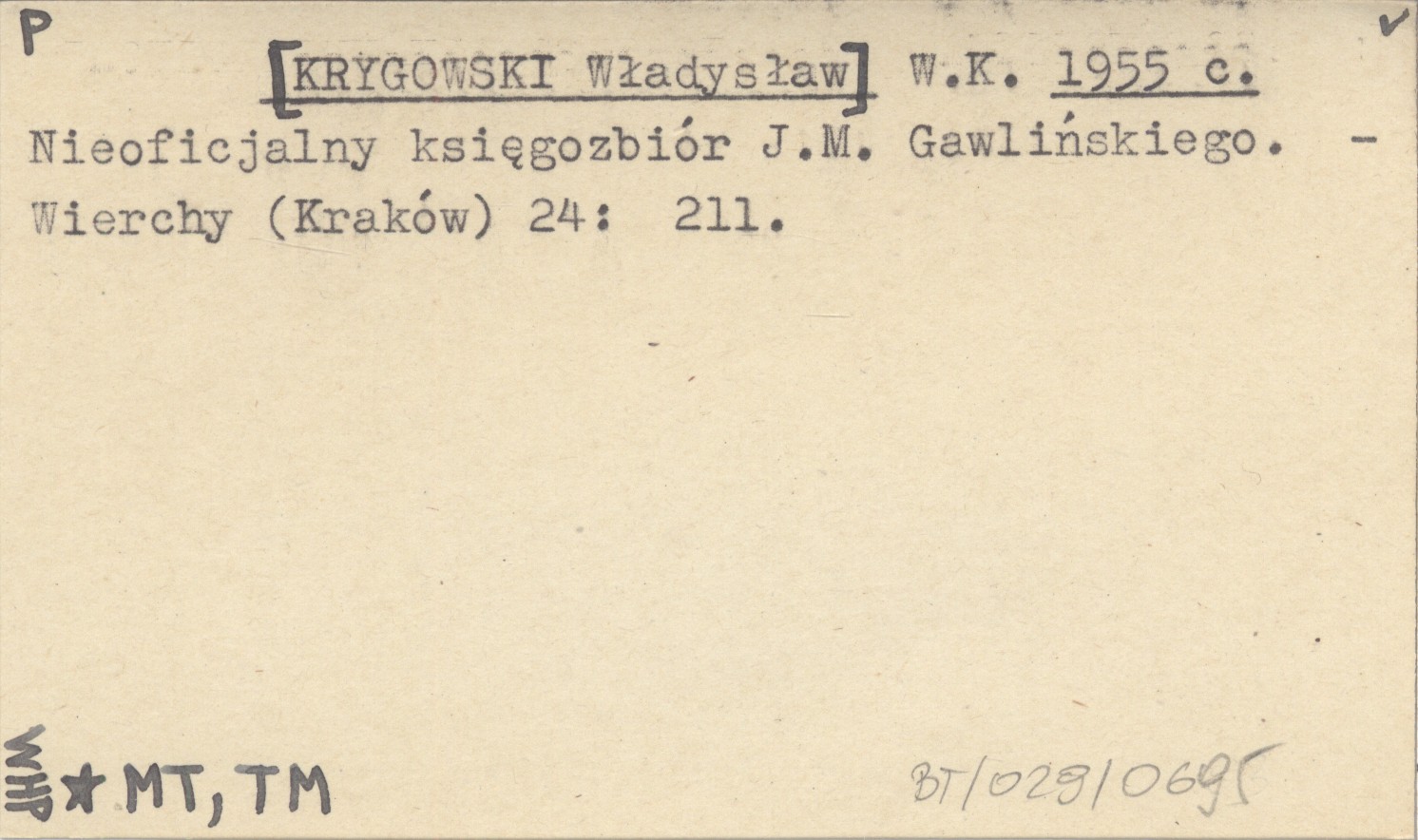 W. K. [KRYGOWSKI Władysław] 1955 c Nieoficjalny księgozbiór J. M. Gawlińskiego.