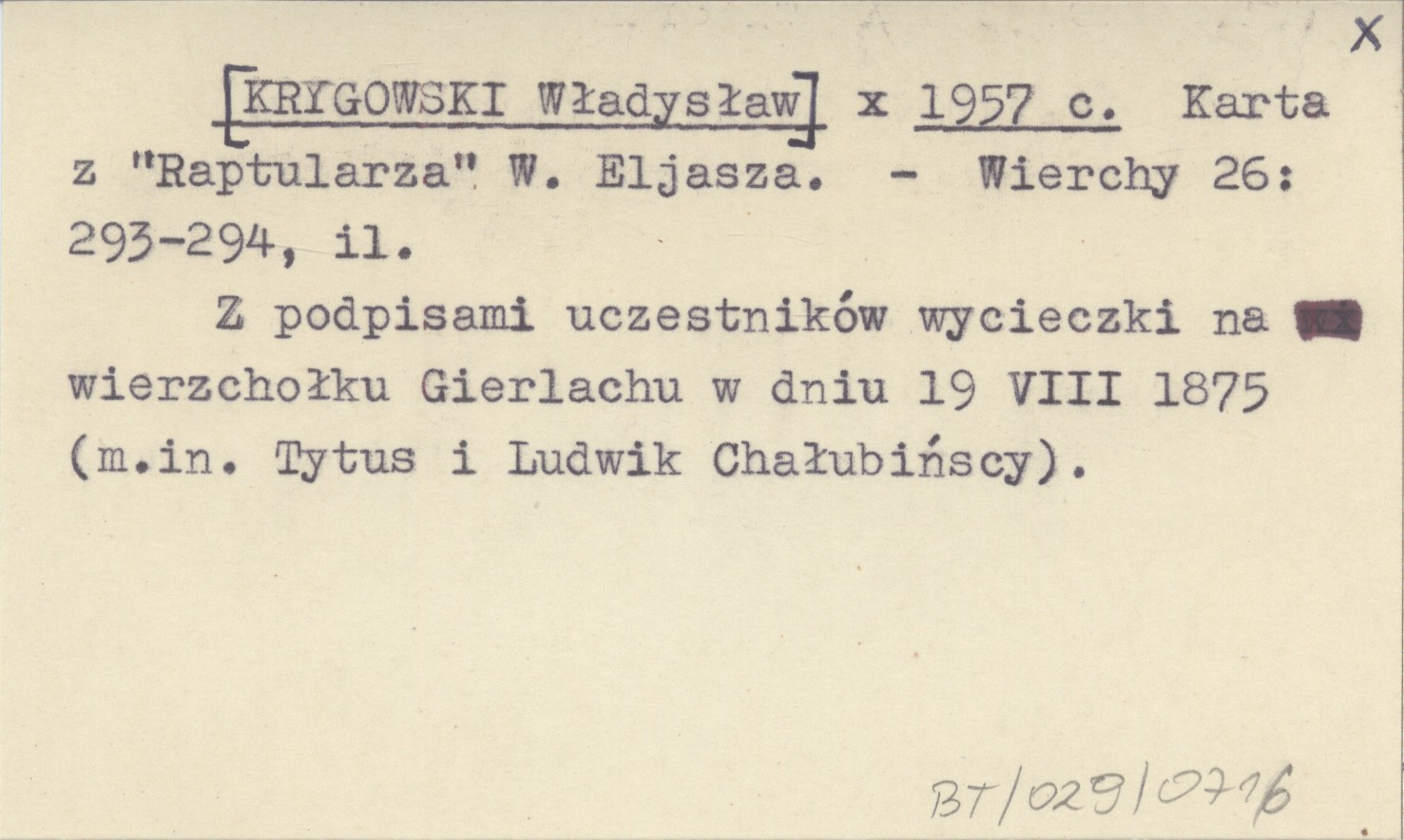 Wierchy, 26: 293-294, il. Z podpisami uczestników wycieczki na wierzchołku Gierlachu w dniu 19 VIII 1875 (m. in. Tytus i Ludwik Chałubińscy).
