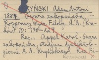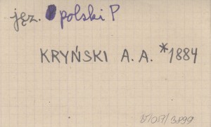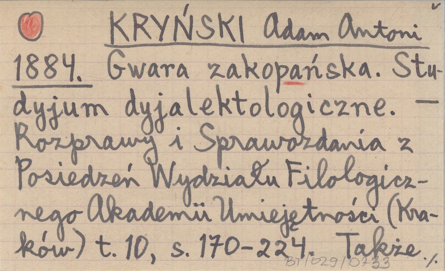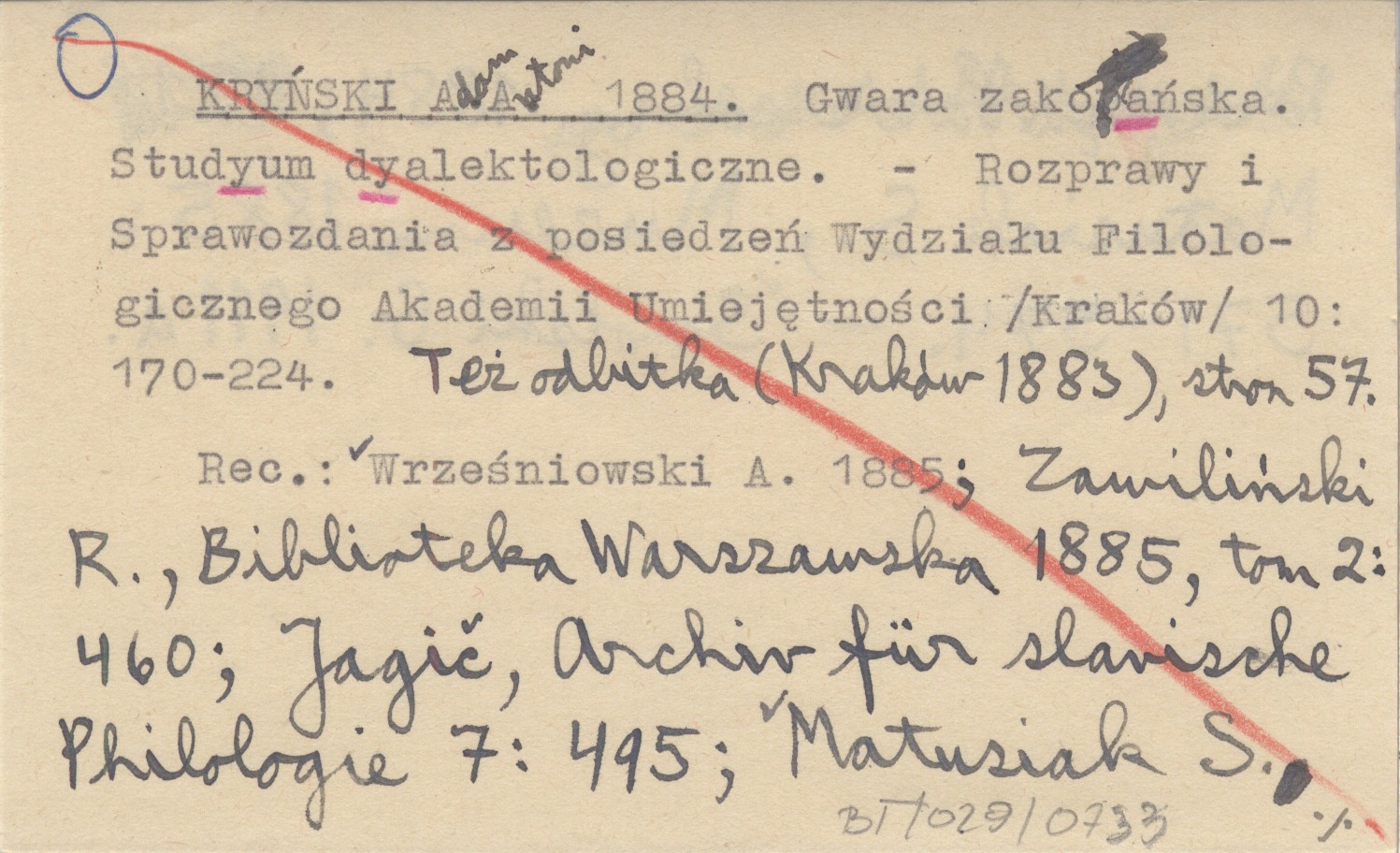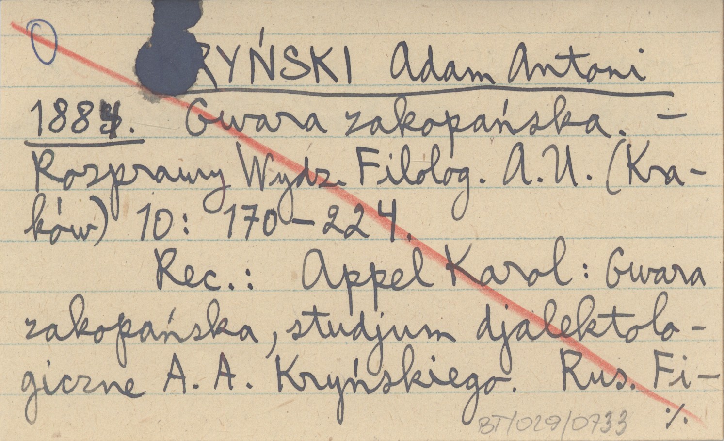 Rozprawy i Sprawozdania z Posiedzeń Wydziału Filologicznego Akademii Umiejętności (Kraków) , T. 10: 170-224. Także odbitka (r. 1883). REC: APPEL Karol: Gwara zakopańska, studyjum dyjalektologiczne. A. A. Kryńskiego. Rus. Fililogicz. Wiestnik, 1884 (też jako odbitka) ; WRZEŚNIOWSKI A. 1885 ; ZAWILIŃSKI R., Biblioteka Warszawska 1885, t. 2: 460 ; JAGIČ, Archiv für slovische Philologie 7: 495 ; MATUSIAK S. 1884 ; MATUSIAK S., Muzeum 1885: 571-574 ; SMÓLSKI G. 1911 a ;