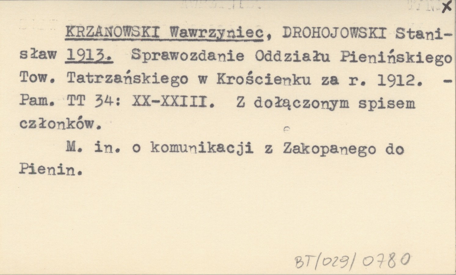 KRZANOWSKI Wawrzyniec DROHOJOWSKI, Stanisław. ; 1913 Sprawozdanie Oddziału Pienińskiego Tow. Tatrzańskiego w Krościenku za r. 1912.