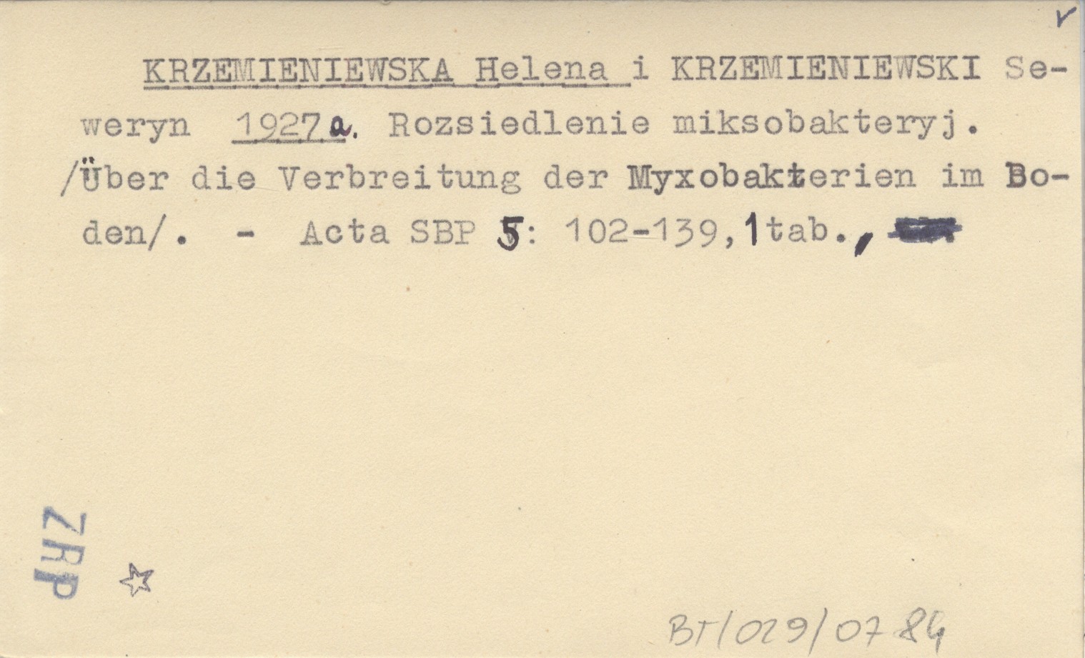 KRZEMIENIEWSKA Helena KRZEMIENIEWSKI, Seweryn. ; 1927 a Rozsiedlenie miksobakteryj. (Über die Verbreitung der Myxobakterien im Boden).
