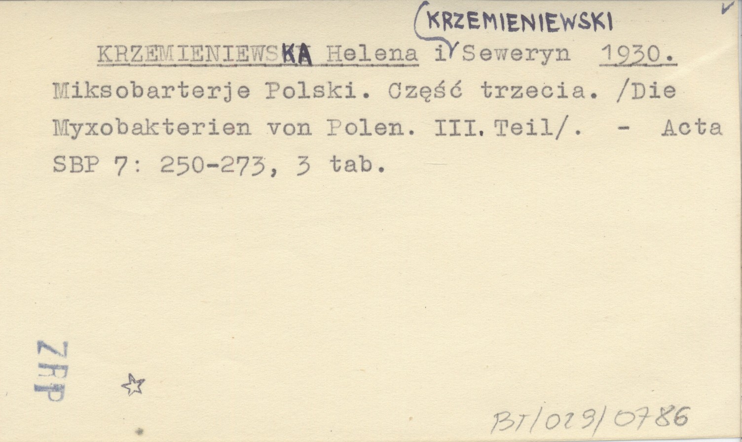 KRZEMIENIEWSKA Helena KRZEMIENIEWSKI, Seweryn. ; 1930 Miksobakterje Polski. Część trzecia. (Die Myxobakterien von Polen. III. Teil).
