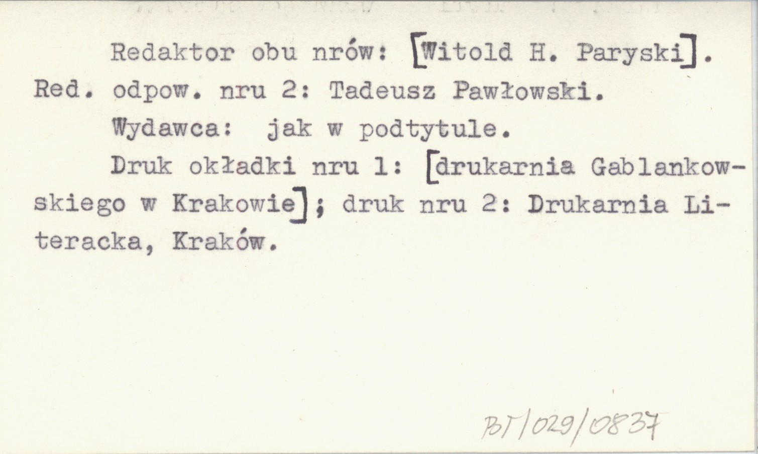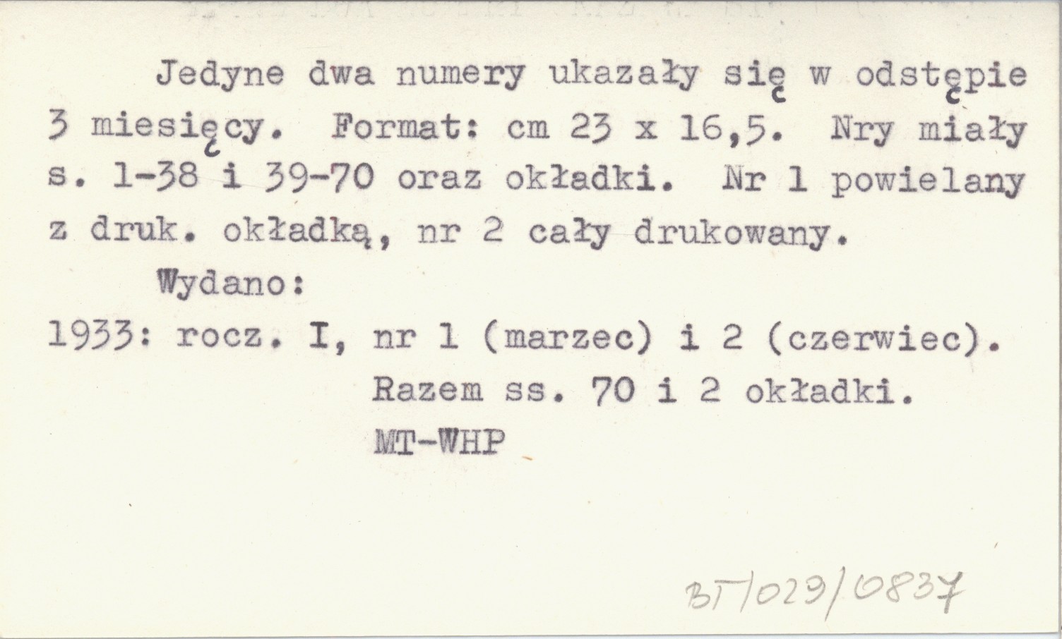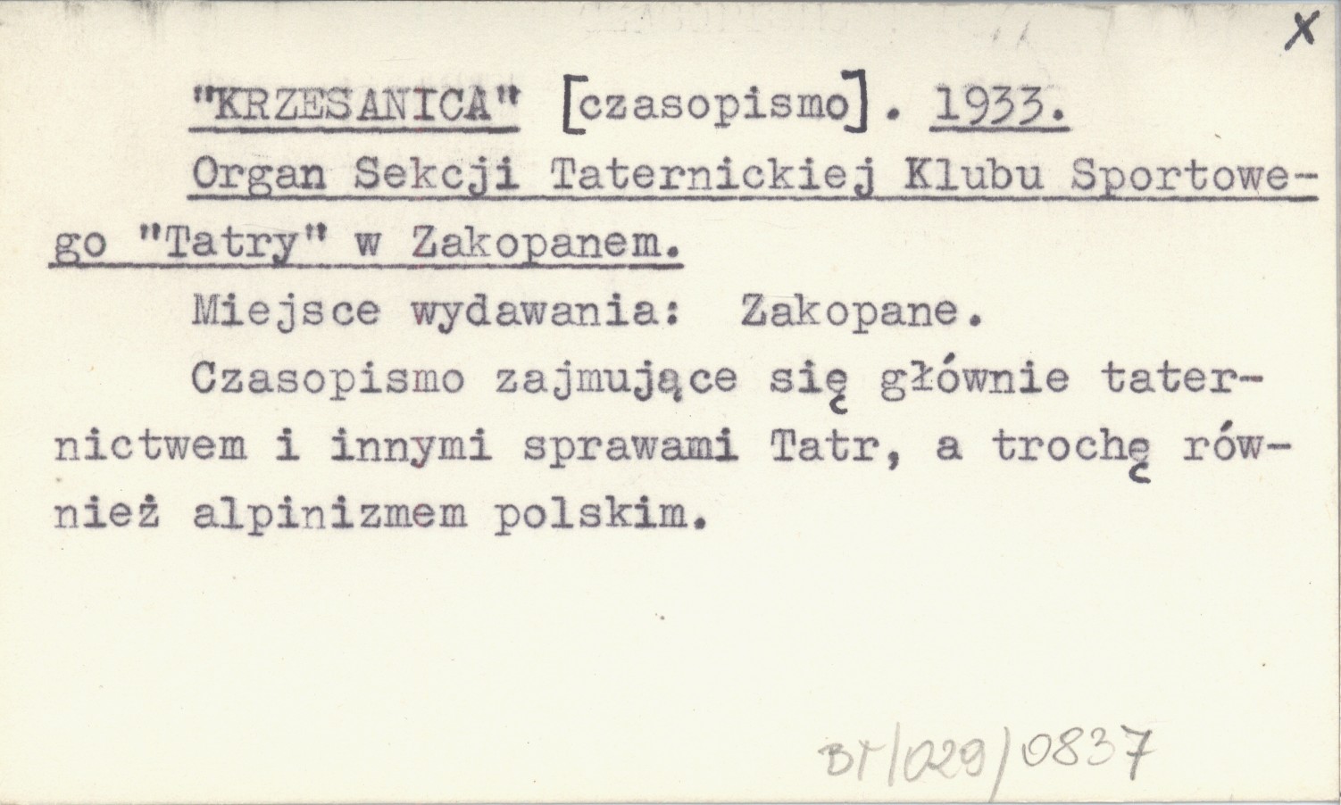 Krzesanica, Organ Sekcji Taternickiej Klubu Sportowego "Tatry" w Zakopane R. 1, Nr 1 (marzec): 1-38, okł. ; nr 2(czerwiec): 39-70, okł., 23x17 cm. Zakopane Sekcja Taternicka Klubu Sportowego "Tatry" w Zakopanem, Czasopismo zajmujące się głównie taternictwem i innymi sprawami Tatr, a trochę również alpinizmem polskim. Jedyne dwa numery ukazały się w odstępie 3 miesięcy. Nr 1 powielany z drukowaną okładką, nr 2 cały drukowany. Druk okładki nr 1: [drukarnia Gablankowskiego w Krakowie] ; druk nr 2: Drukarnia Literacka, Kraków.