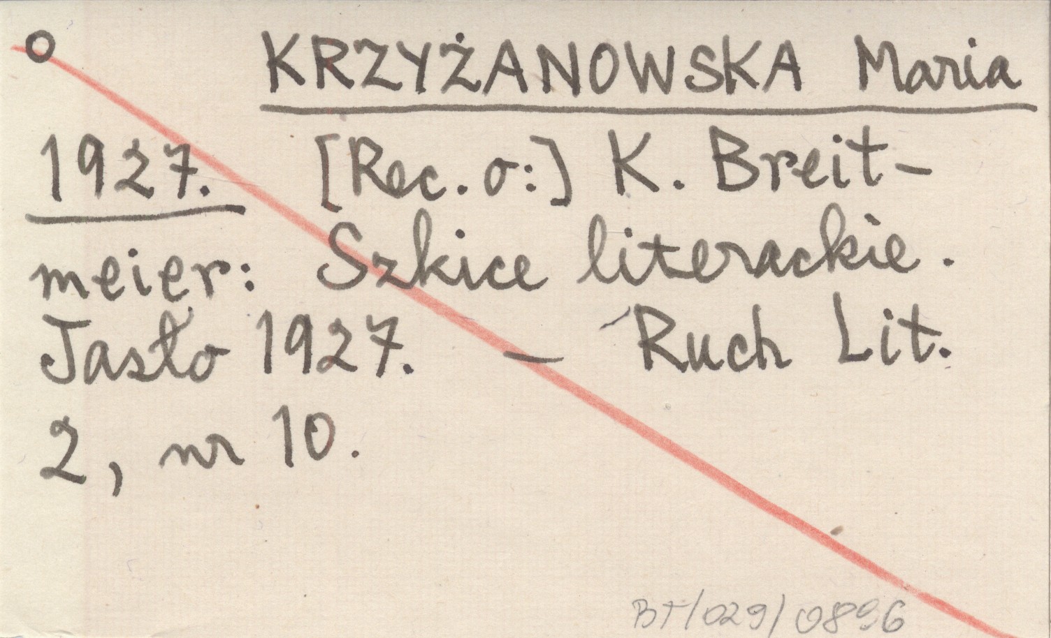 KRZYŻANOWSKA Maria 1927 [Rec. o:] K. Breitmeier: Szkice literackie. Jasło 1927.