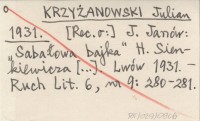 KRZYŻANOWSKI Julian 1931 [Rec. o:] J. Janów: "Sabałowa bajka" H. Sienkiewicza [...]. Lwów 1931.