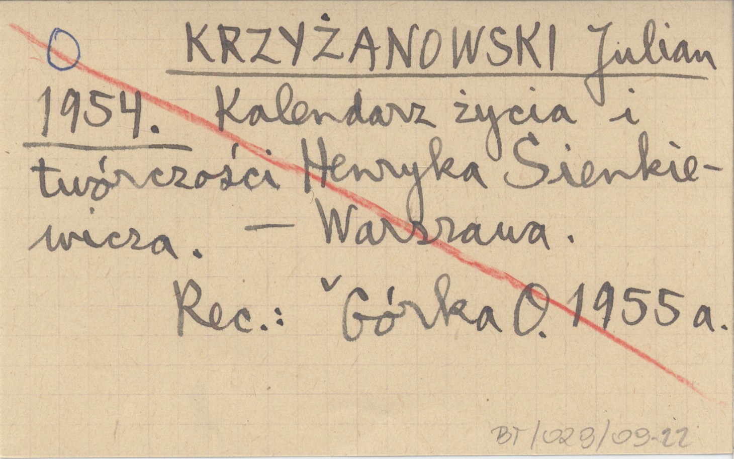 KRZYŻANOWSKI Julian 1954 Kalendarz życia i twórczości Henryka Sienkiewicza.