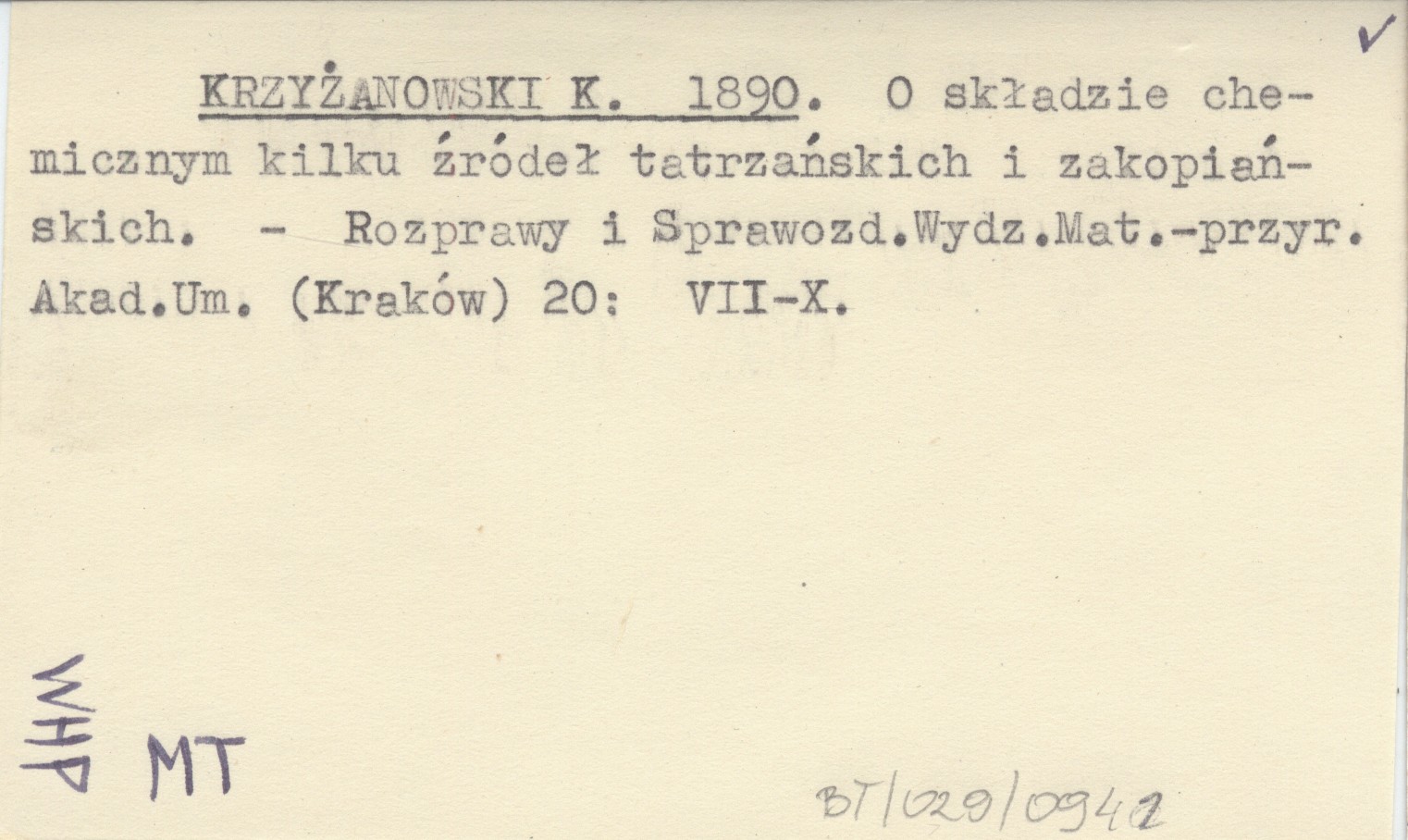 KRZYŻANOWSKI K. 1890 O składzie chemicznym kilku źródeł tatrzańskich i zakopiańskich.