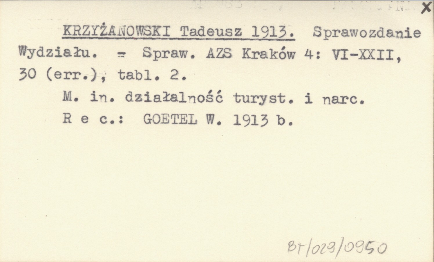Sprawozdanie Akademickiego Związku Sportowego (Kraków) , 4: VI-XXII, 30 (err.), 2 k. M. in. działalność turystyczna i narciarska. REC: GOETEL W. 1913 b