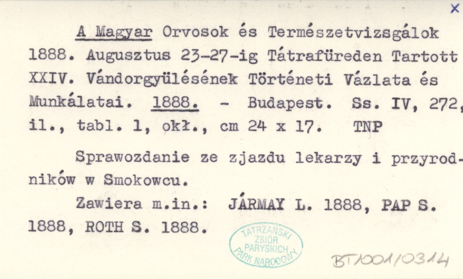 Budapest , IV, 272 s., il., 1 k. tabl., okł., 24x17 cm. Sprawozdanie ze zjazdu lekarzy i przyrodników w Smokowcu. Zawiera m. in. JÁRMAY L. 1888, PAP S. 1888, ROTH S. 1888.