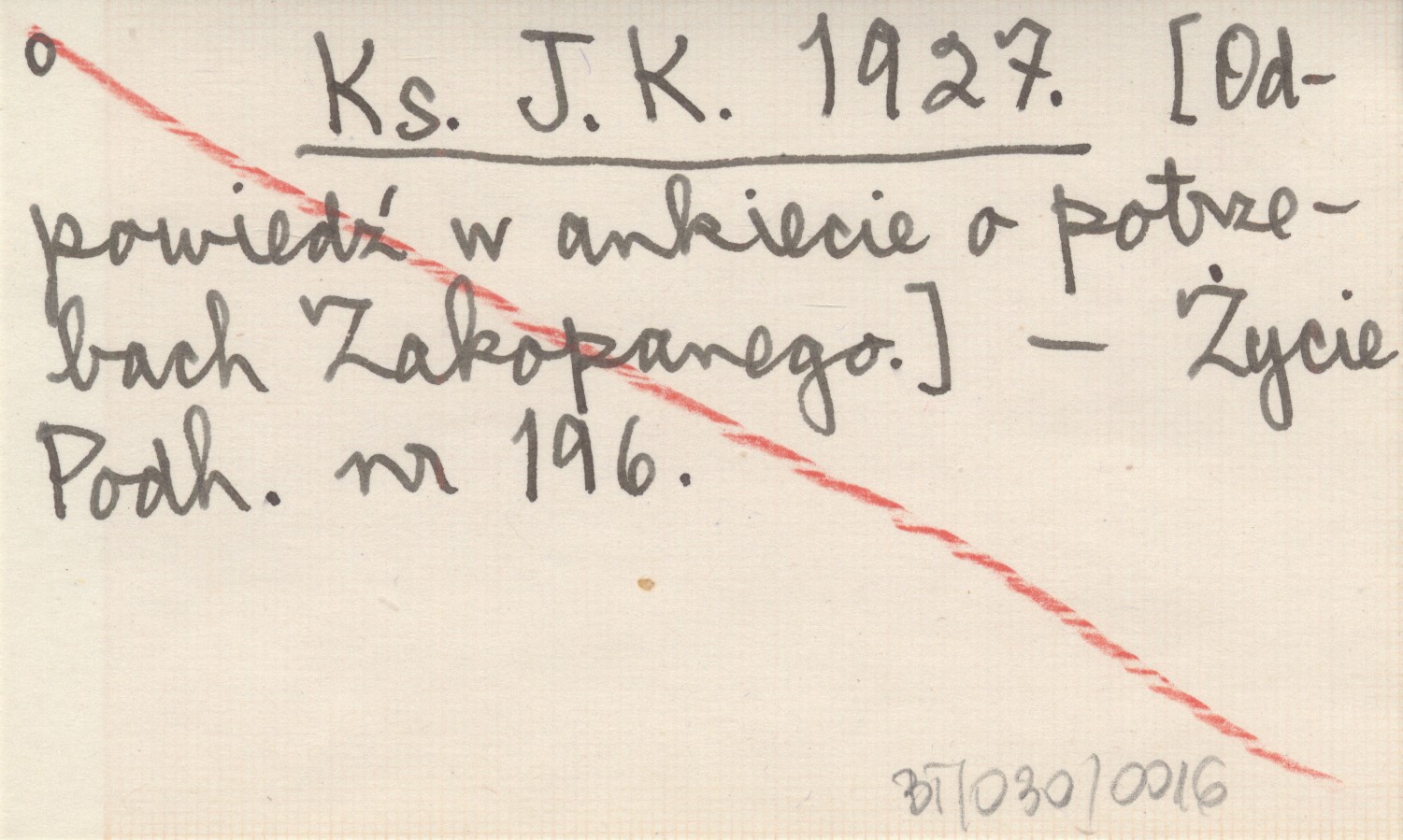 Ks. J. K. 1927 [Odpowiedź w ankiecie o potrzebach Zakopanego.]