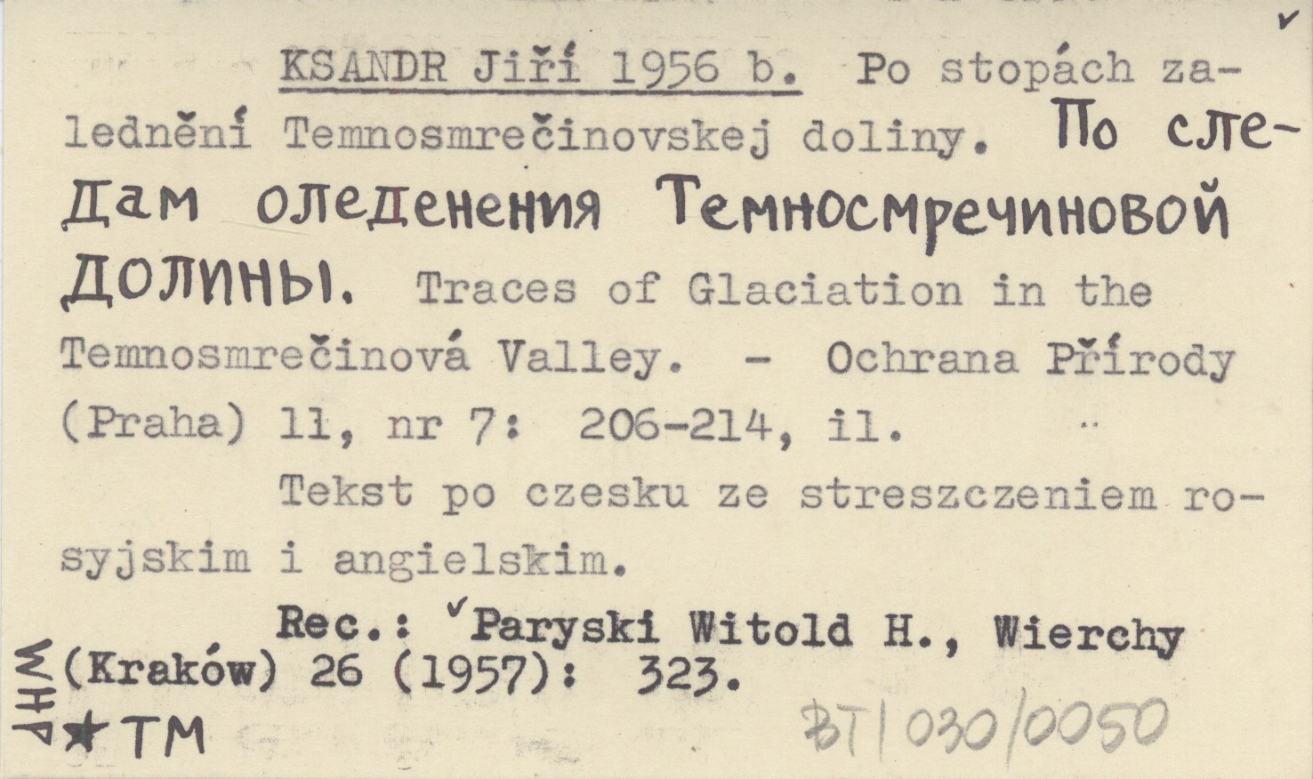 KSANDR Jiří 1956 b Po stopách zalednění Temnosmrečinovskej doliny. Po sledam oledenenija Temnosmrečinovoj doliny. Traces of Glaciation in the Temnosmrečinová Valley.