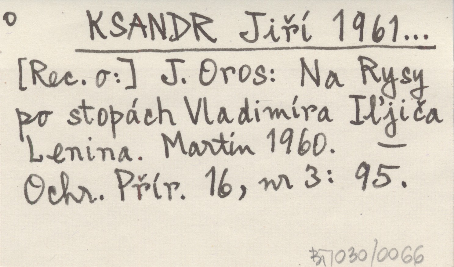 KSANDR Jiří 1961... [Rec o:] J. Oros: Na Rysy po stopách Vladimíra Iľjiča Lenina. Martin 1960.