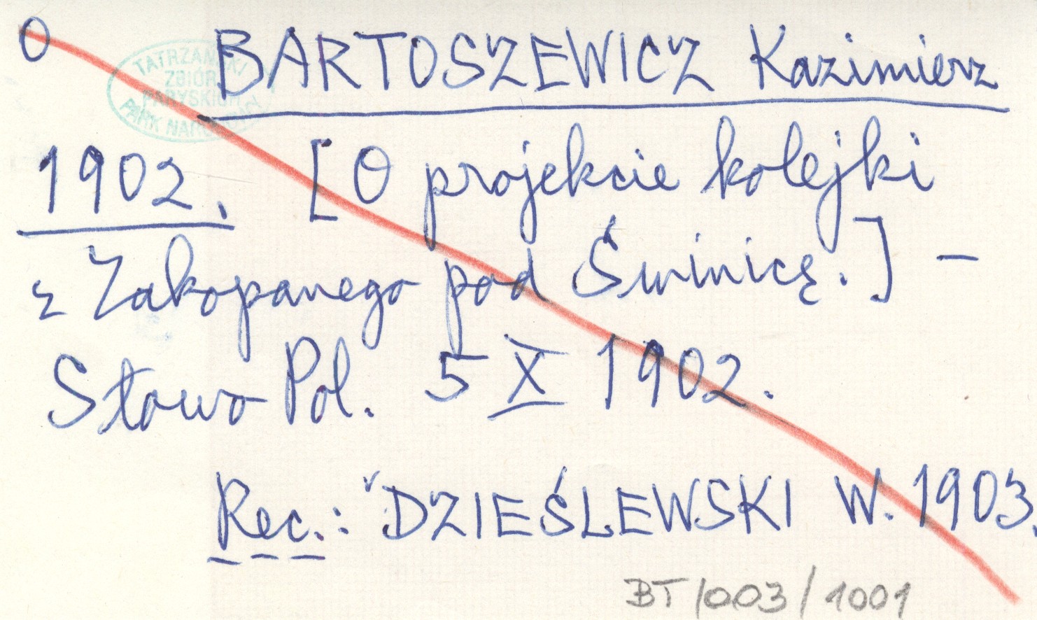 BARTOSZEWICZ Kazimierz 1902 [O projekcie kolejki z Zakopanego pod Świnicę.]