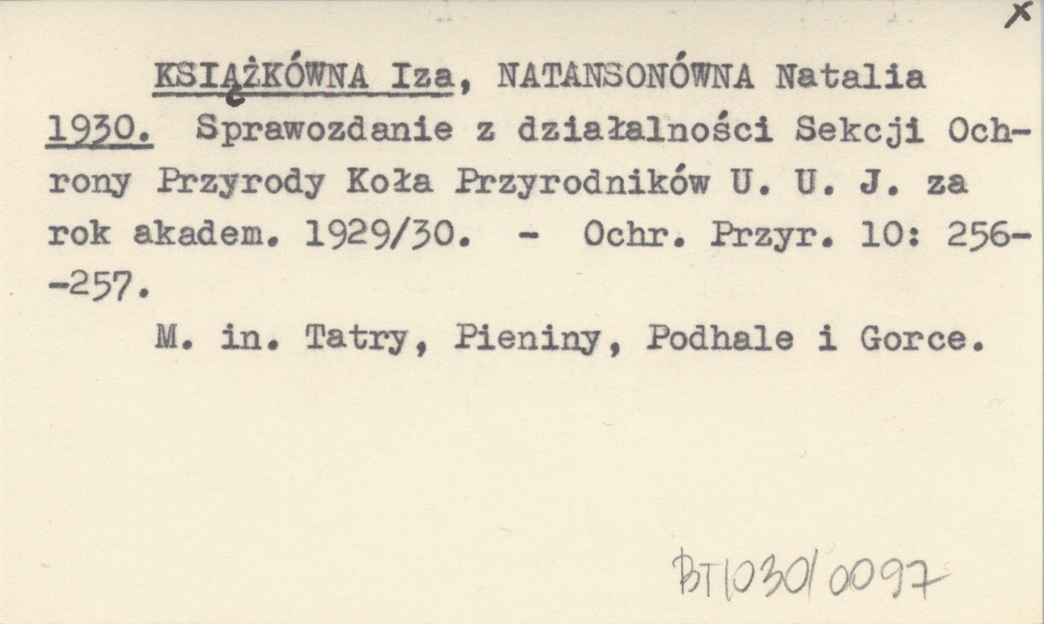 KSIĄŻKÓWNA Iza NATANSONÓWNA, Natalia. ; 1930 Sprawozdanie z działalności Sekcji Ochrony Przyrody Koła Przyrodników U.U.J. za rok akadem. 1929/30.