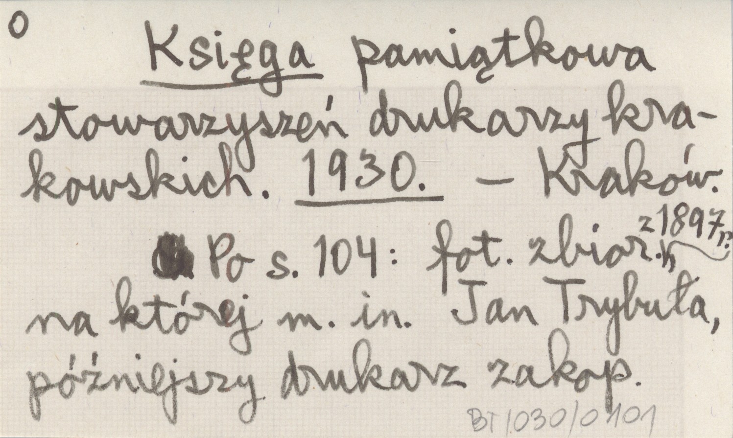 Kraków , Po s. 104: fot. zbiorowa z 1897 r., na której m. in. Jan Trybuła, późniejszy drukarz zakopiański.