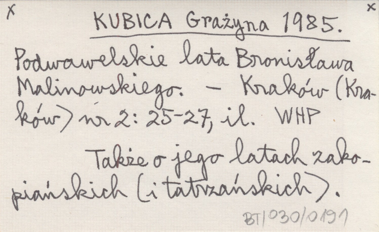 KUBICA Grażyna 1985 Podwawelskie lata Bronisława Malinowskiego.