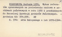 KUBICZKOWA Barbara 1974 Wykaz referatów opracowanych na posiedzenia naukowe w archiwach państwowych w roku 1972 i przekazanych do Naczelnej Dyrekcji Archiwów Państwowych.