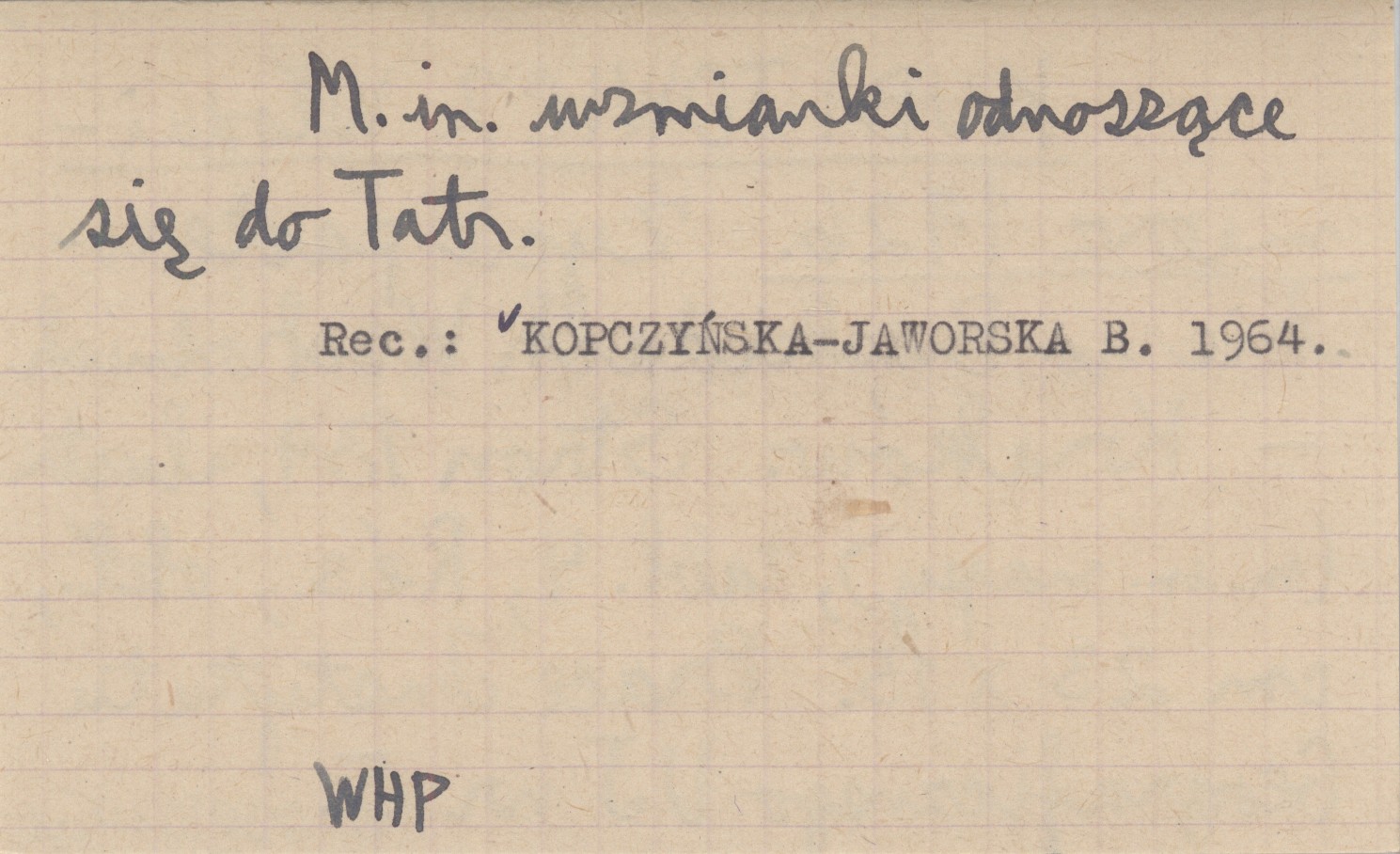 Kraków (Prace Instytutu Geograficznego Uniwersytetu Jagiellońskiego, nr 5) , 139 s., il. (m. in. mapy), 4 k., Rés., okł., 23x15 cm. M. in. wzmianki odnoszące się do Tatr. REC: KOPCZYŃSKA-JAWORSKA B. 1964