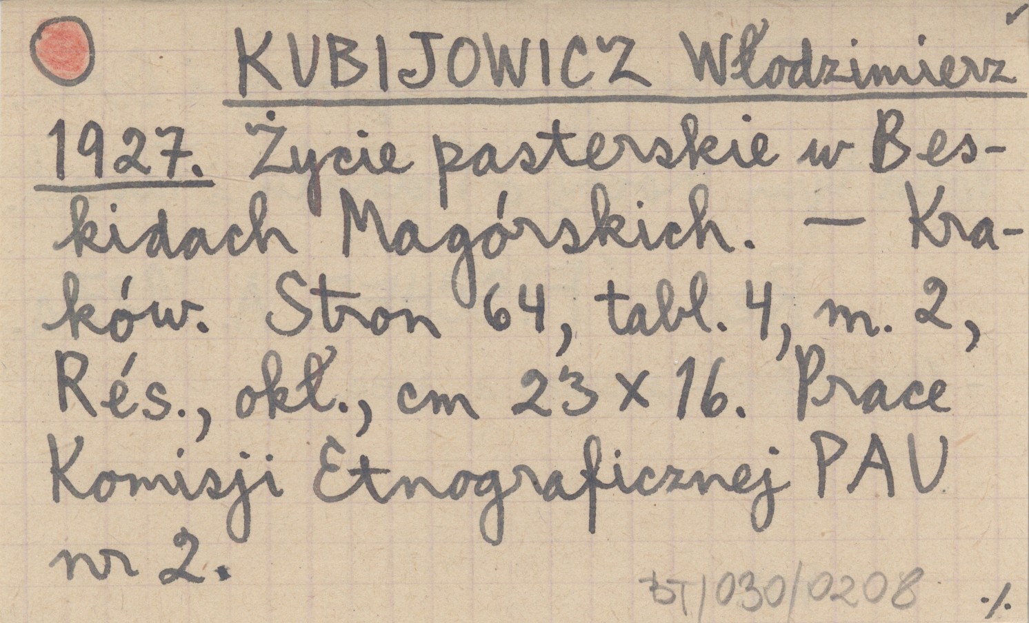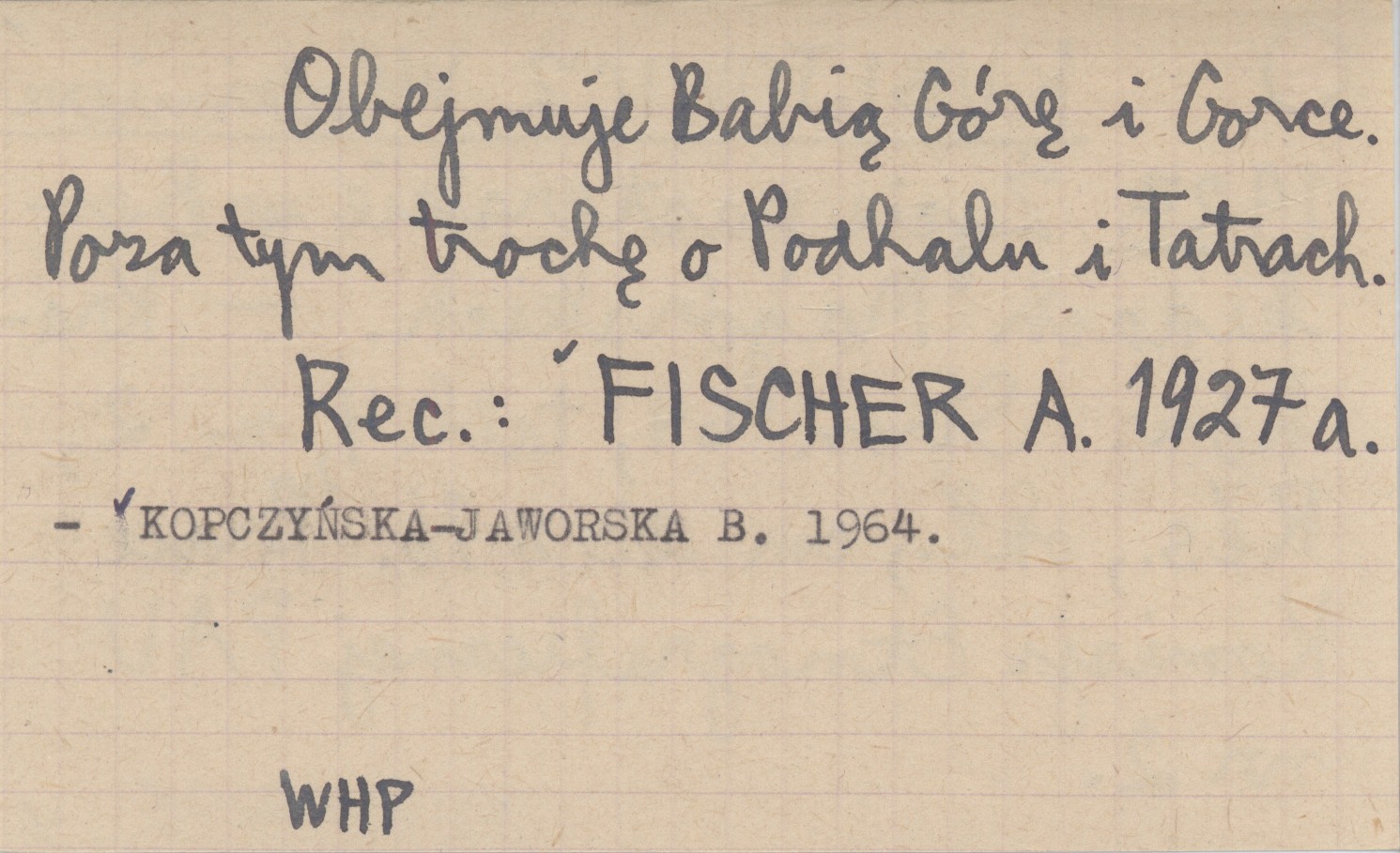 Kraków (Prace Komisji Etnograficznej PAU, nr 2) , 64 s., 4 k., 2 mapy, Rés., okł., 23x16 cm. Obejmuje Babią Górę i Gorce. Poza tym trochę o Podhalu i Tatrach. REC: FISCHER A. 1927 a ; KOPCZYŃSKA-JAWORSKA B. 1964 ;